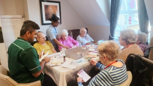 It was a funny moment when our residents and staff got together to make the cards. Everyone smiles and is happy when there is chatting and fun. We create lovely cards in between. Joan, our lovely resident, she is a master card maker and she gave us all lot of advice.