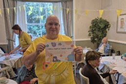 Joined by relatives, the residents and team donated money to play ‘match the name to the bear’, they wore colourful tops, and took turns (15 in total) to ‘pie’ Regional Support Manager Gary.