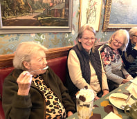 Residents this week went to the Alturo Lounge in Malvern to enjoy afternoon tea and cake……with a bit on the side! Discovering new foods and enjoying old favourites is part of life’s experiences. Residents were delighted to try cheesy chips, and found them to be rather ‘more-ish’ and along with cheesy garlic ciabatta bread, plate of these delicious nibbles were passed up and down the table! And of course, afternoon tea with cakes topped off these treats. Joan went one step further and enjoyed a rather glorious chocolate sundae with cream, cookies and ice cream!