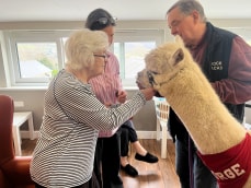 Alpacas are gentle animals who have soft pelts, which makes them great animals for a visit to a care home. They don’t like to be solitary, are quite docile and have soft padded feet so they don’t make too much noise. The lack of noise and their calm nature mean they are great for animal therapy as they don’t make loud noises or have behaviours which could scare someone who is living with a Dementia. Equally, their size and thick pelt mean that people who have dexterity issues (such as those with a Dementia) can gently pet them without worrying.