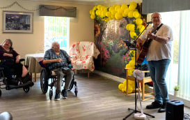 Chris White, a regular and much-loved performer, returned to the home with his guitar and a set of classic tunes. As always, he made sure to play the residents’ favourites, creating a fun and relaxing atmosphere. Surrounded by spring-themed decorations put together by the wellbeing team, Chris once again delivered a memorable show that lifted everyone’s spirits.