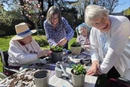 With help from the team, residents, and some family members, they spent the day planting and arranging pots around the garden.